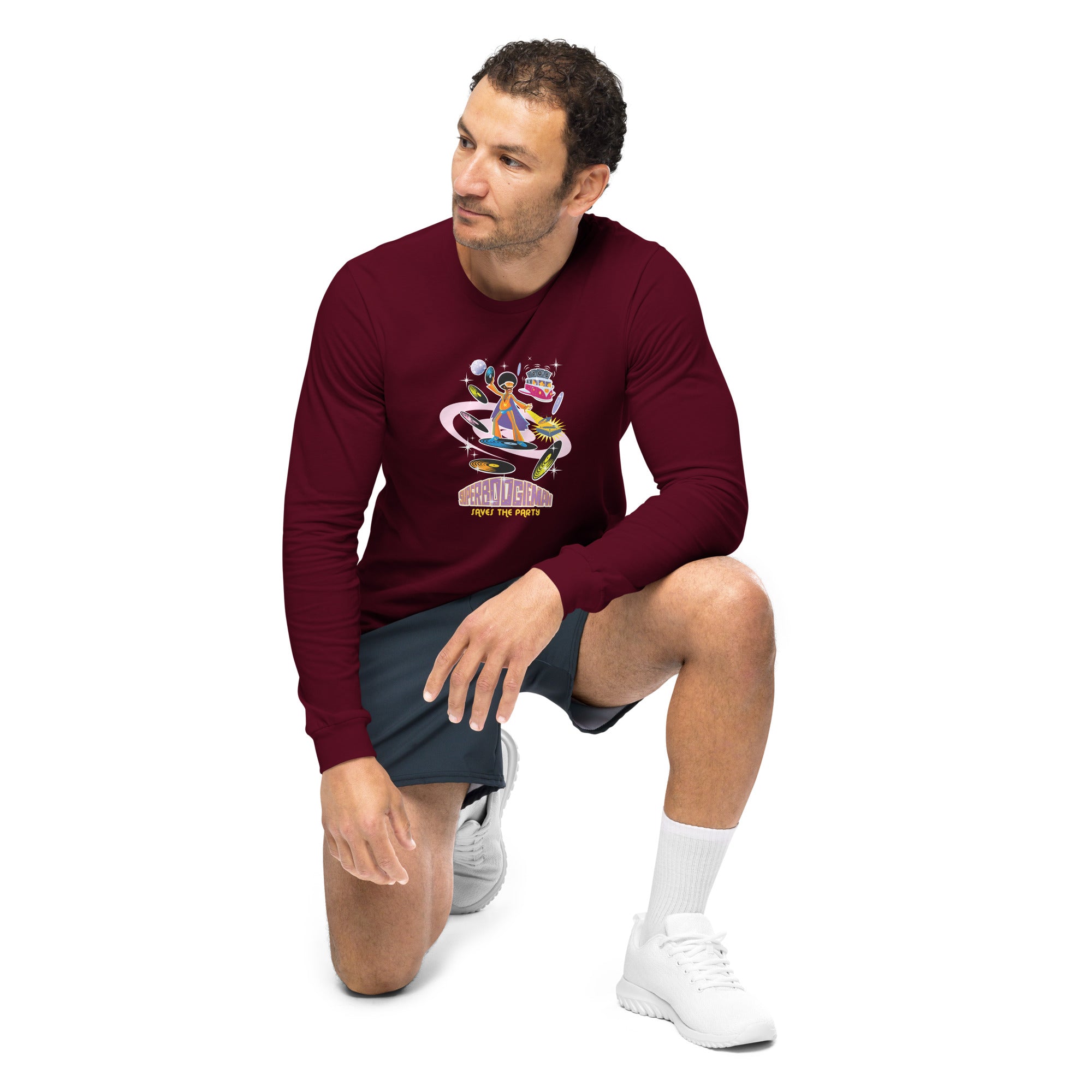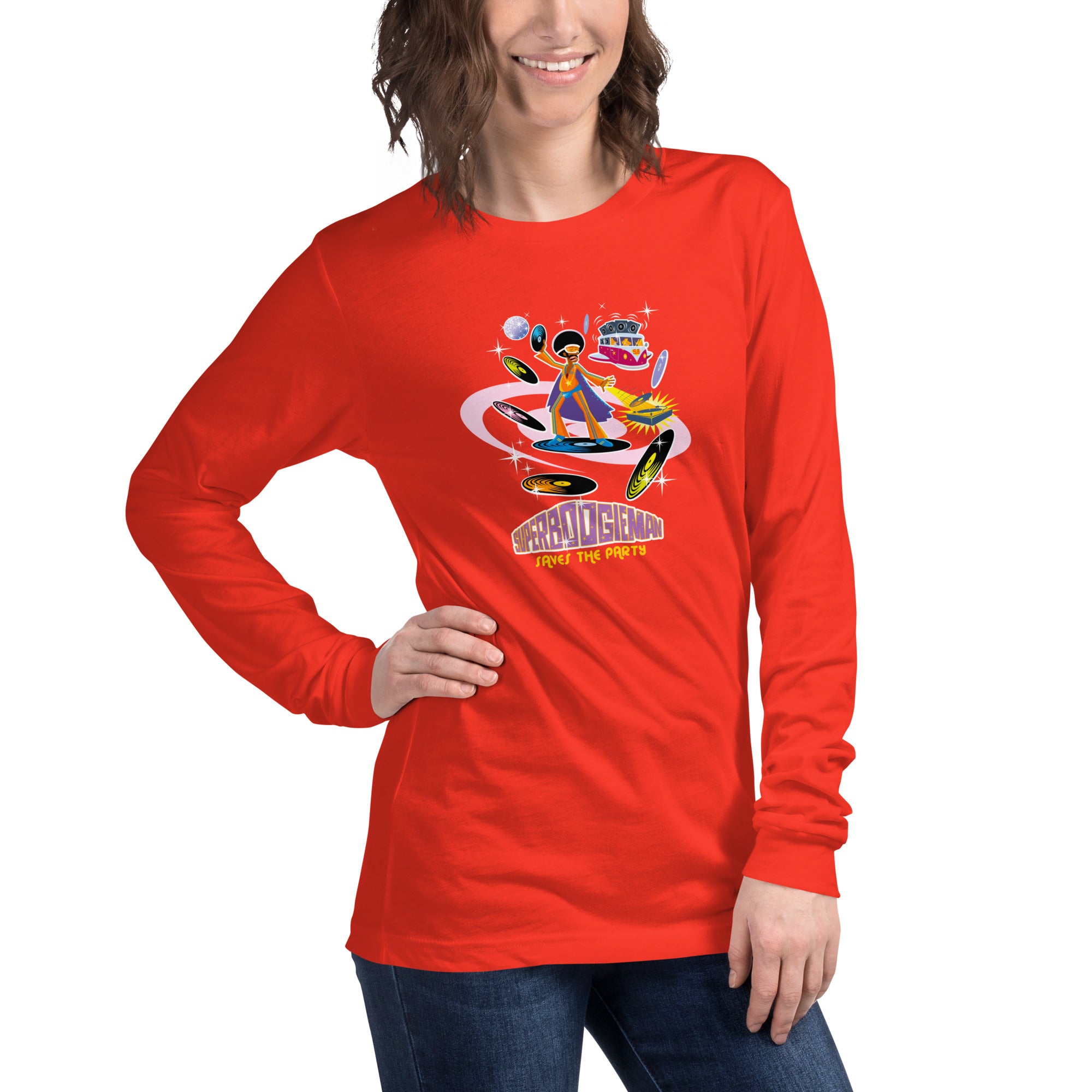 Unisex Long Sleeve Tee Superboogieman Saves the Party (front & back)