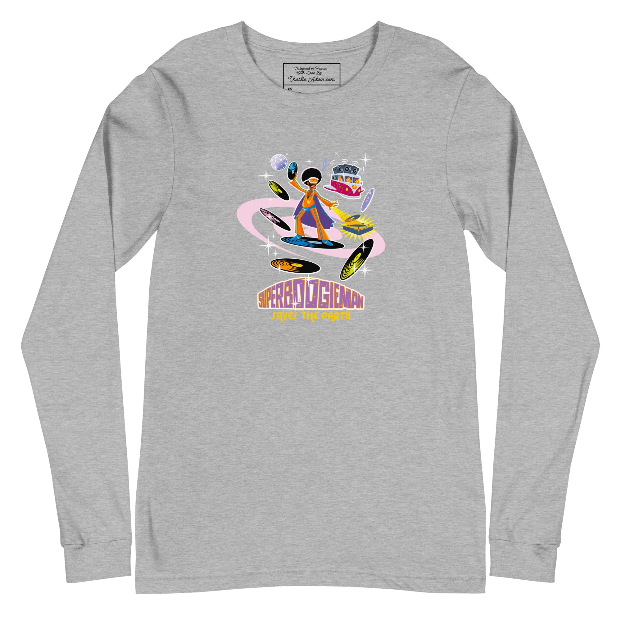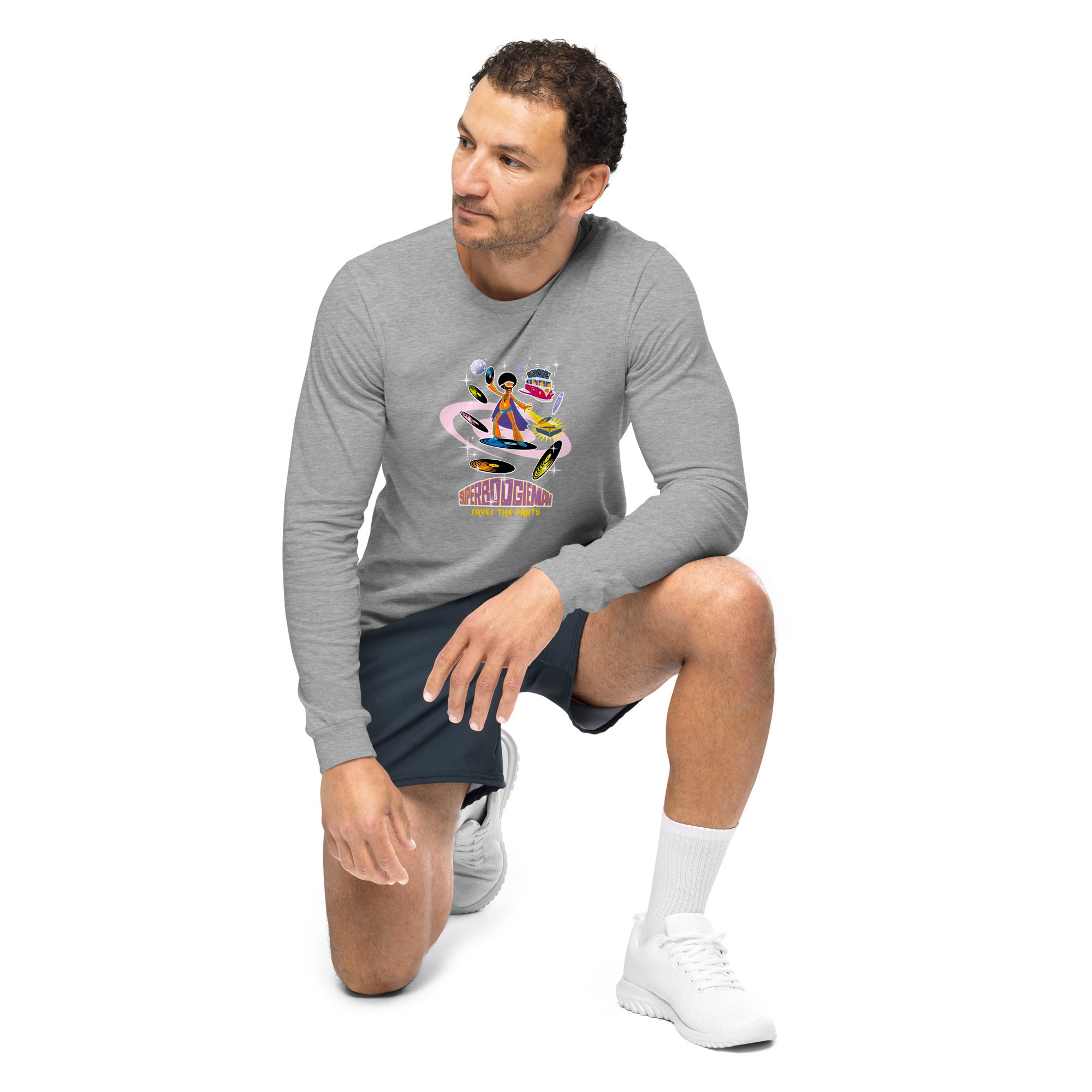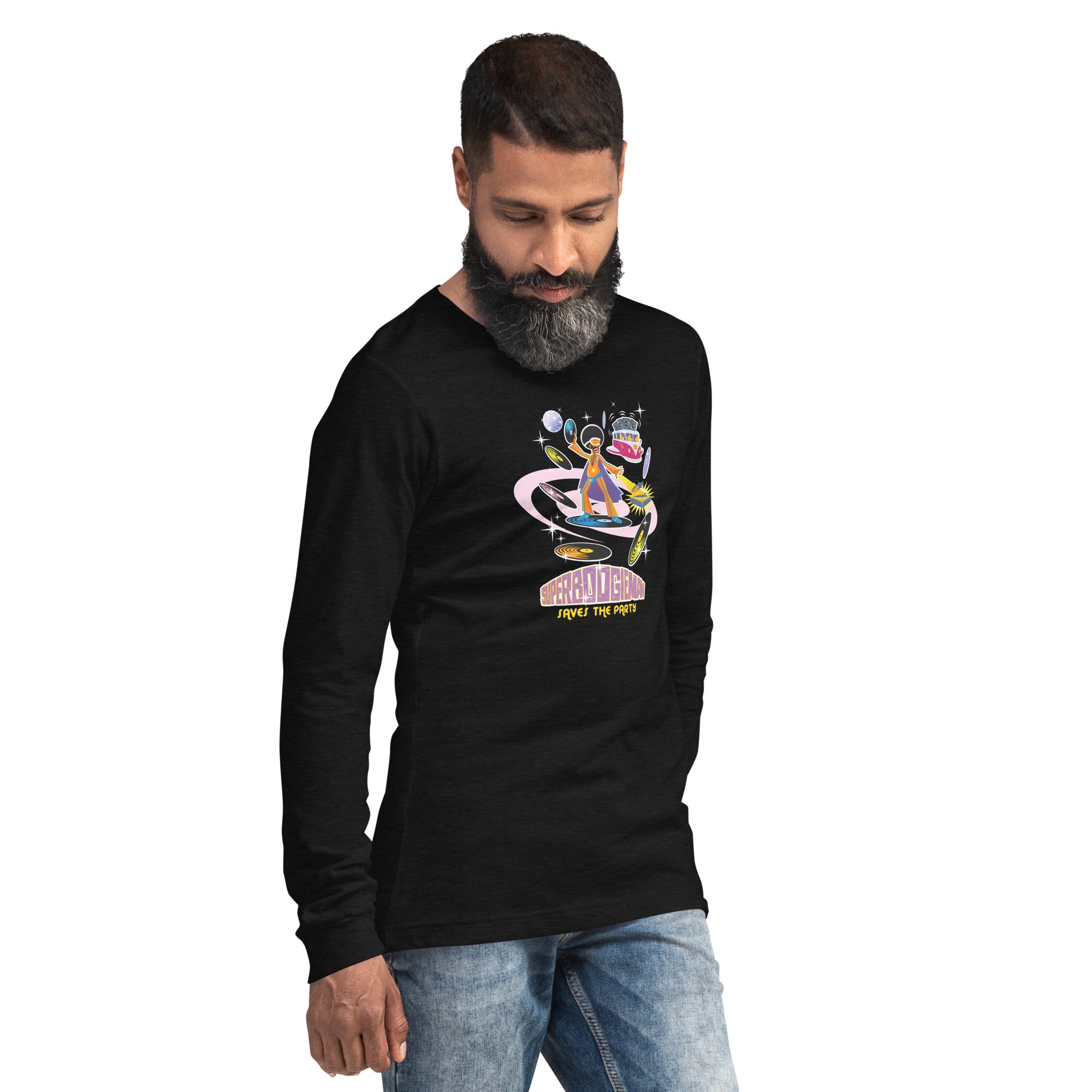 Unisex Long Sleeve Tee Superboogieman Saves the Party (front & back) on heather colors