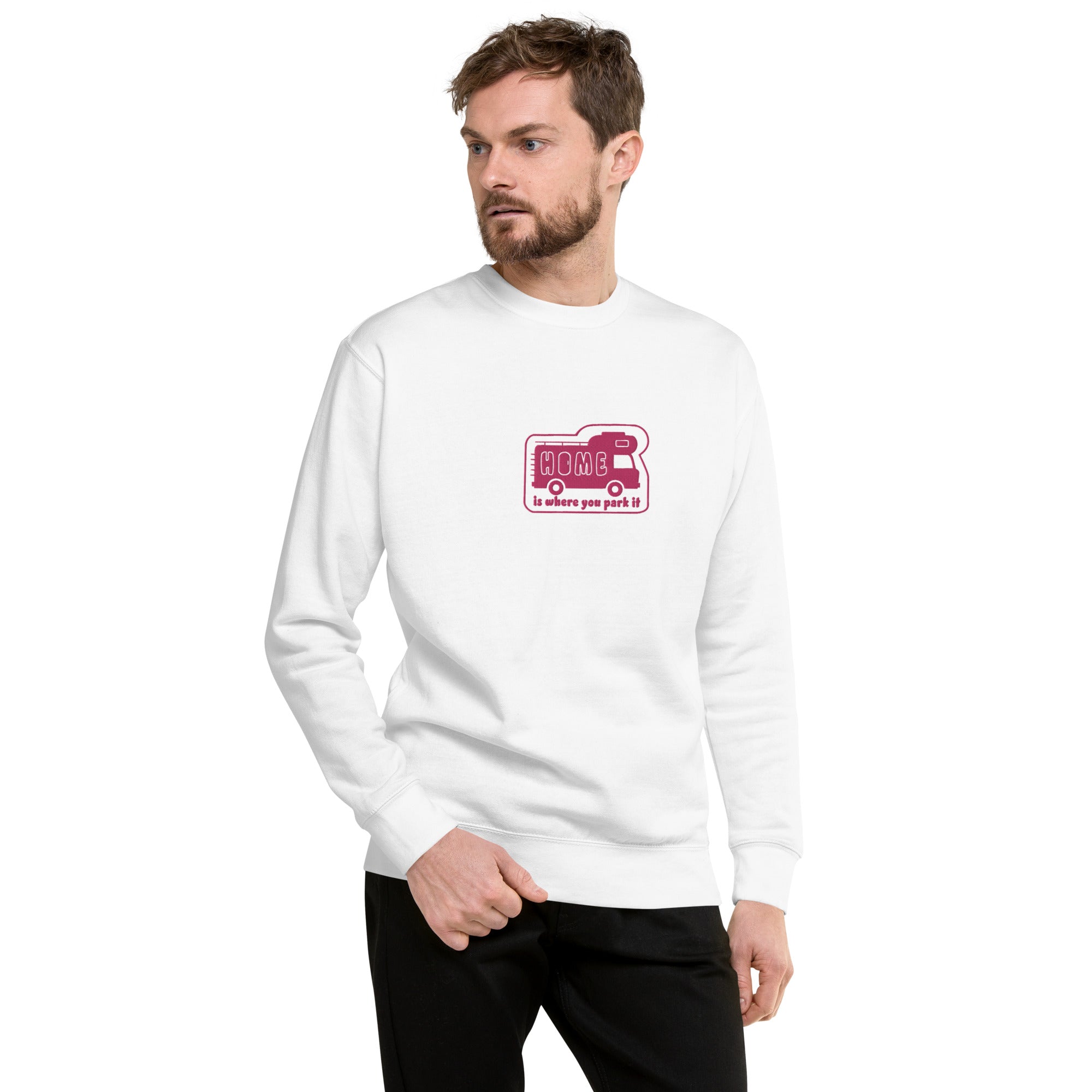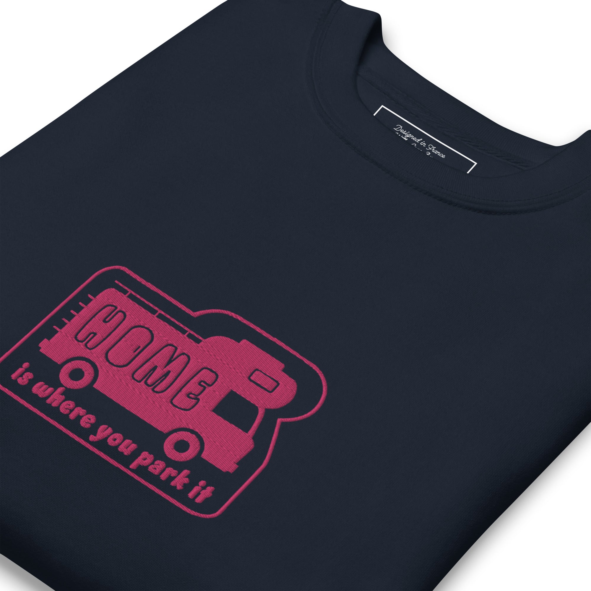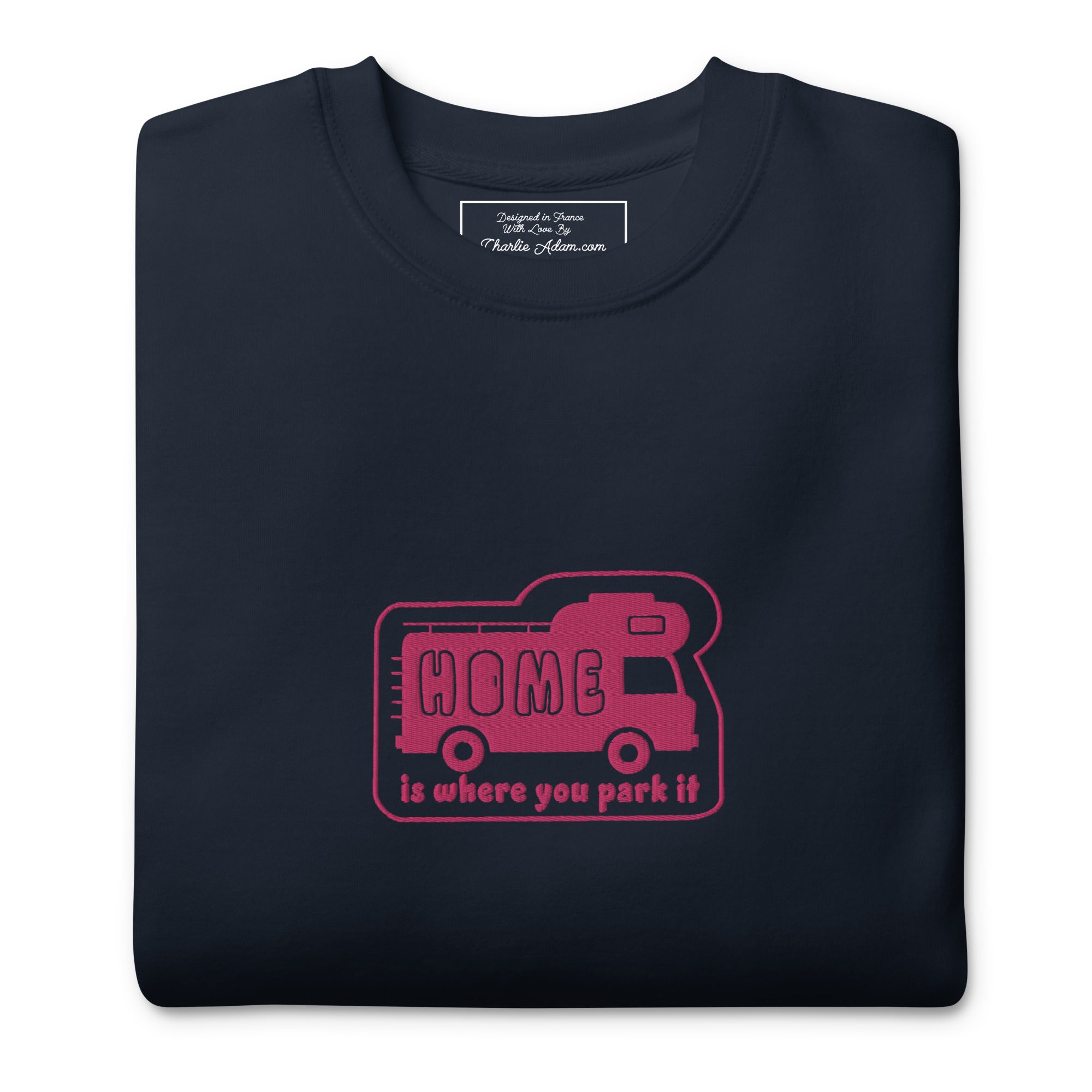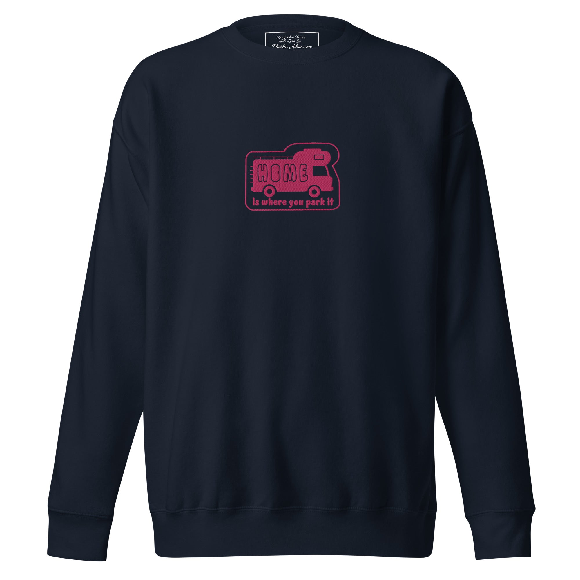 Unisex Premium Sweatshirt Bold Camper Van Home is where you park it flamingo embroidered pattern