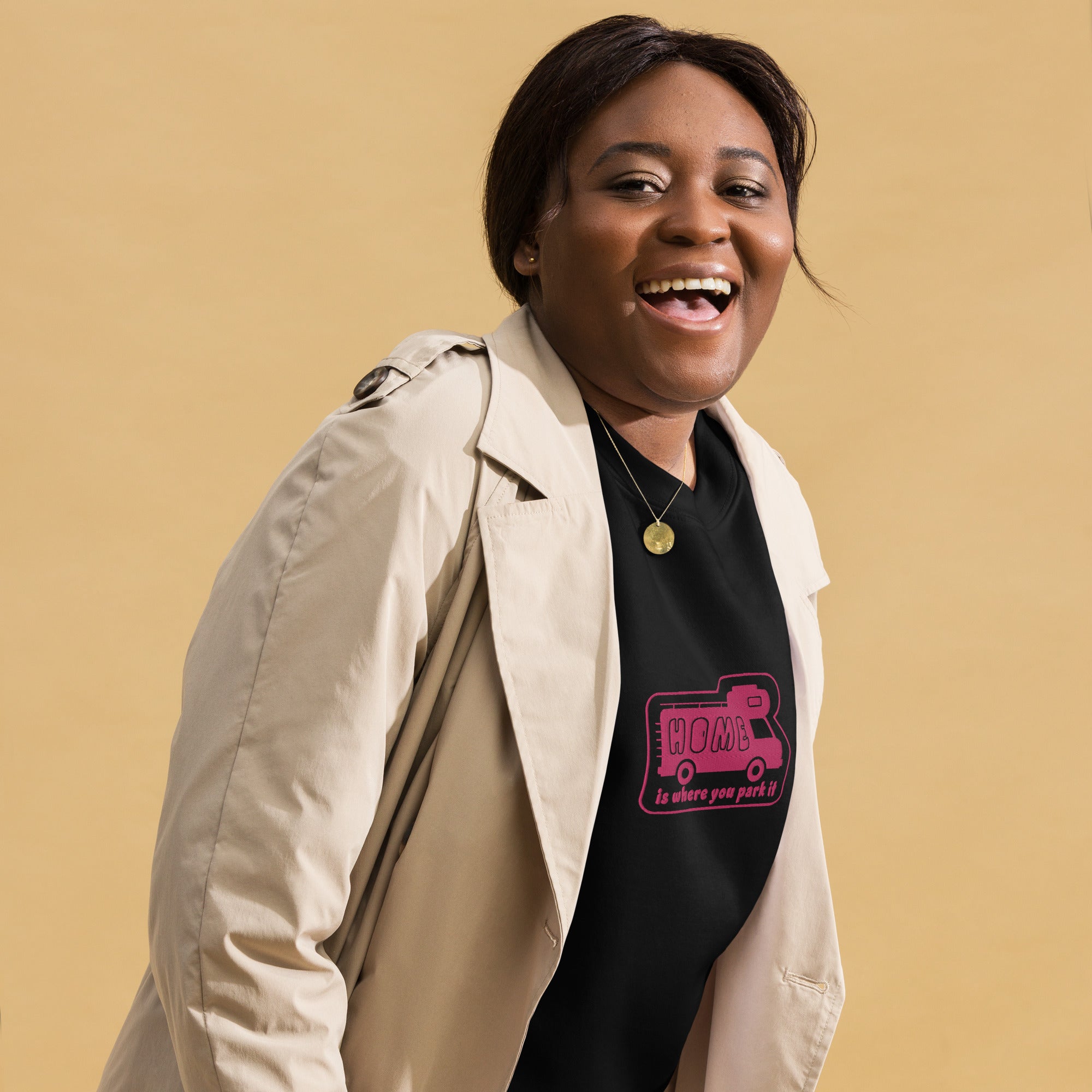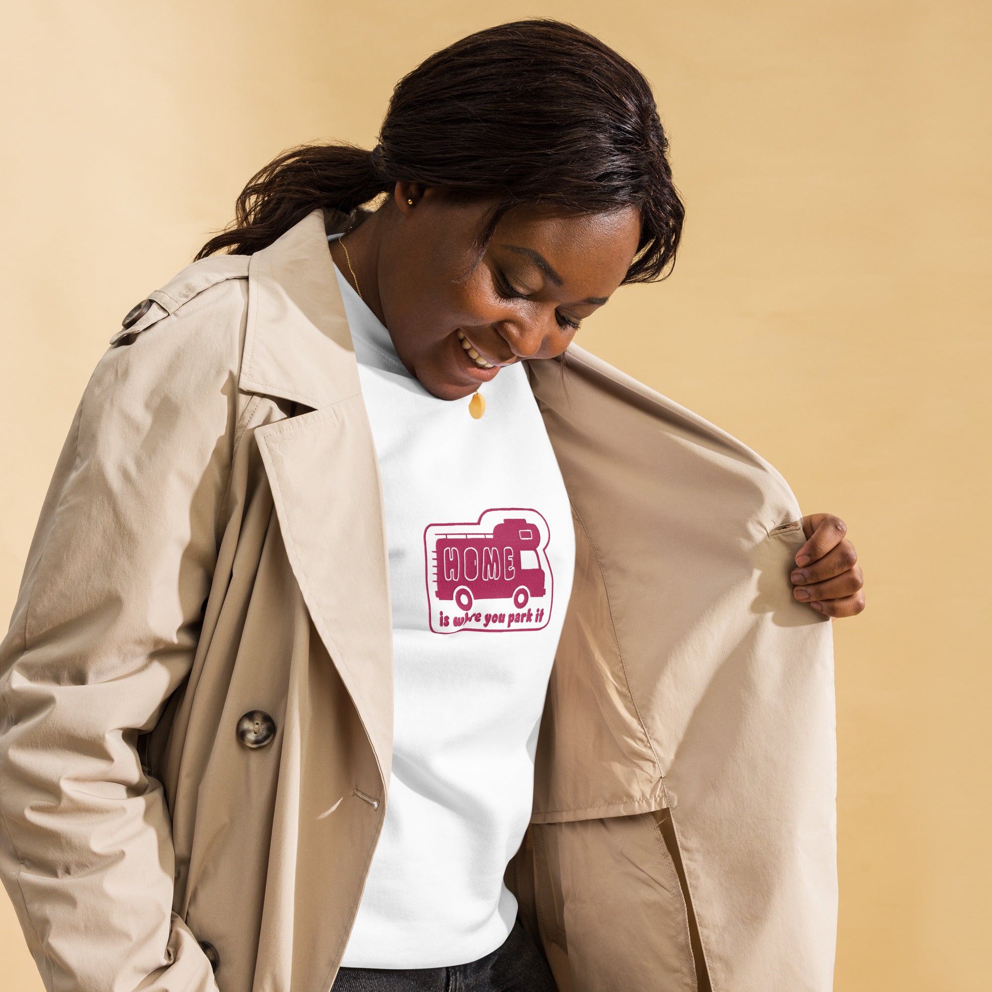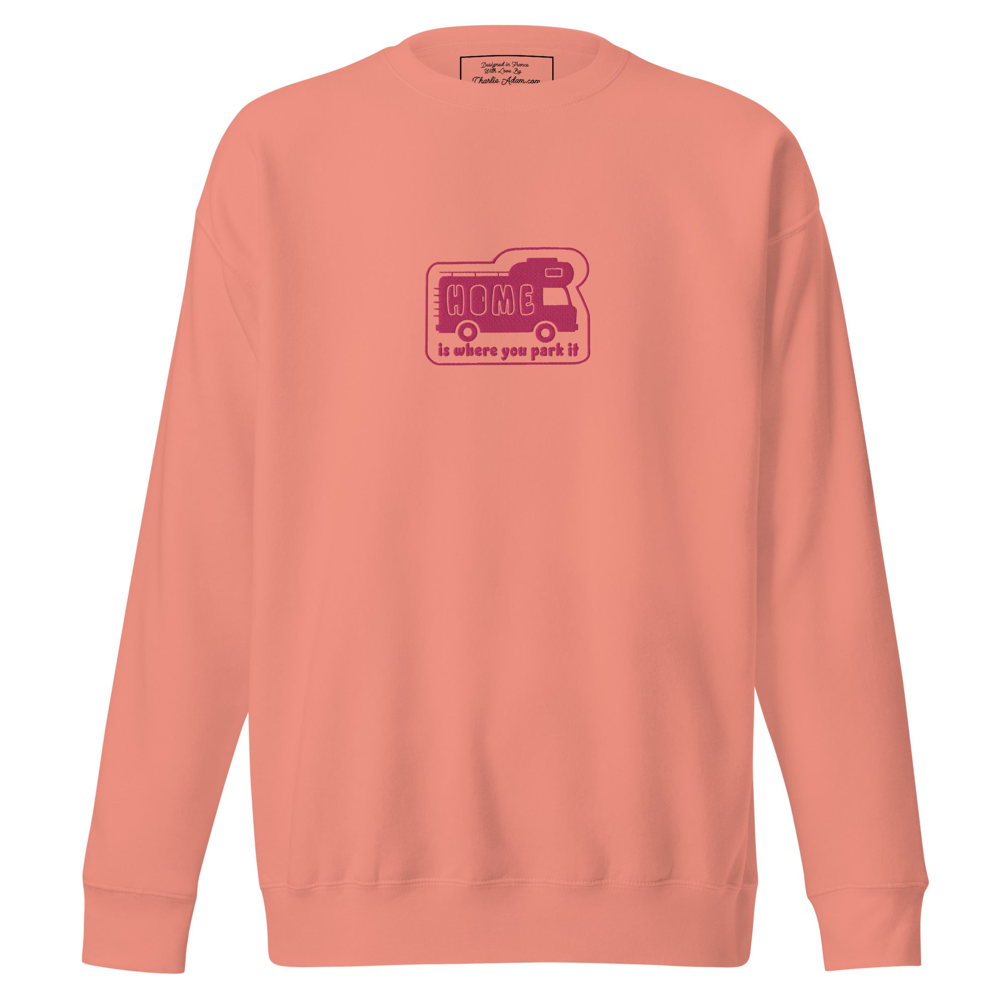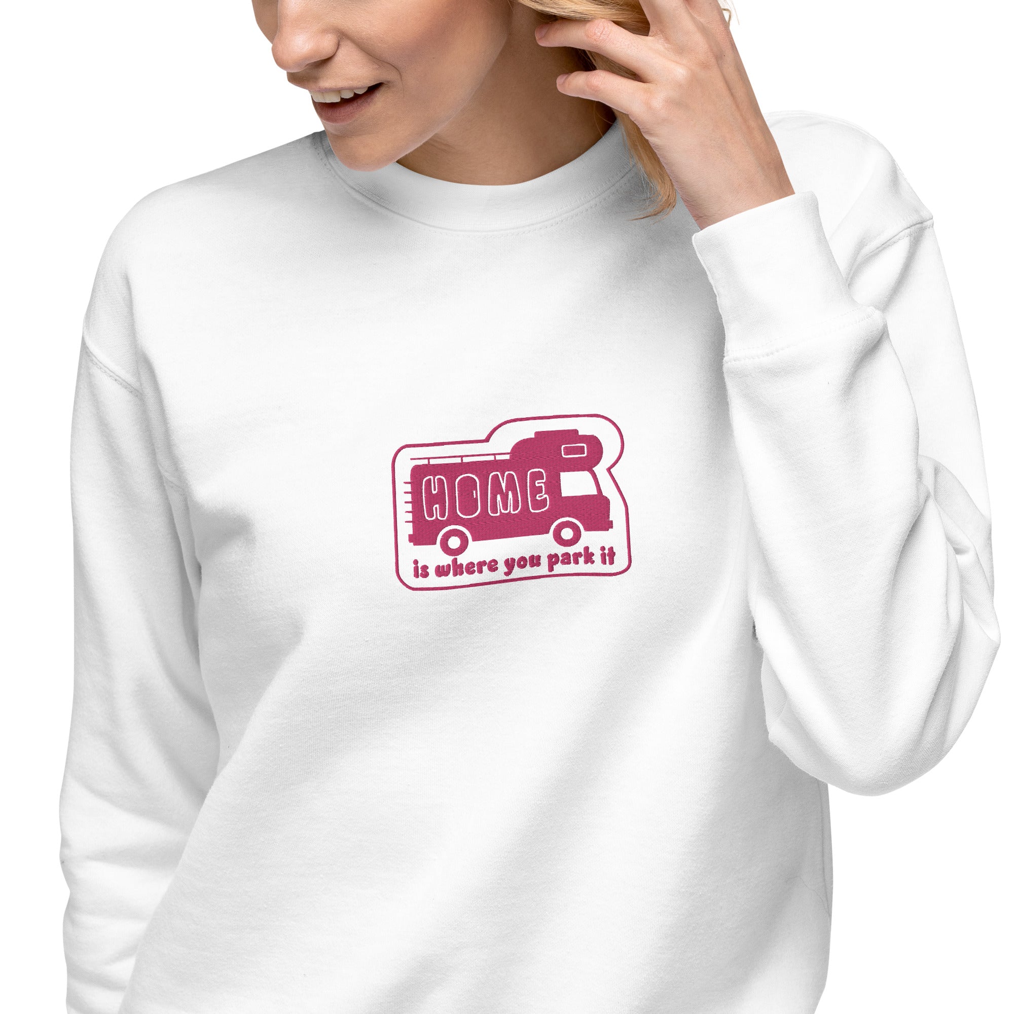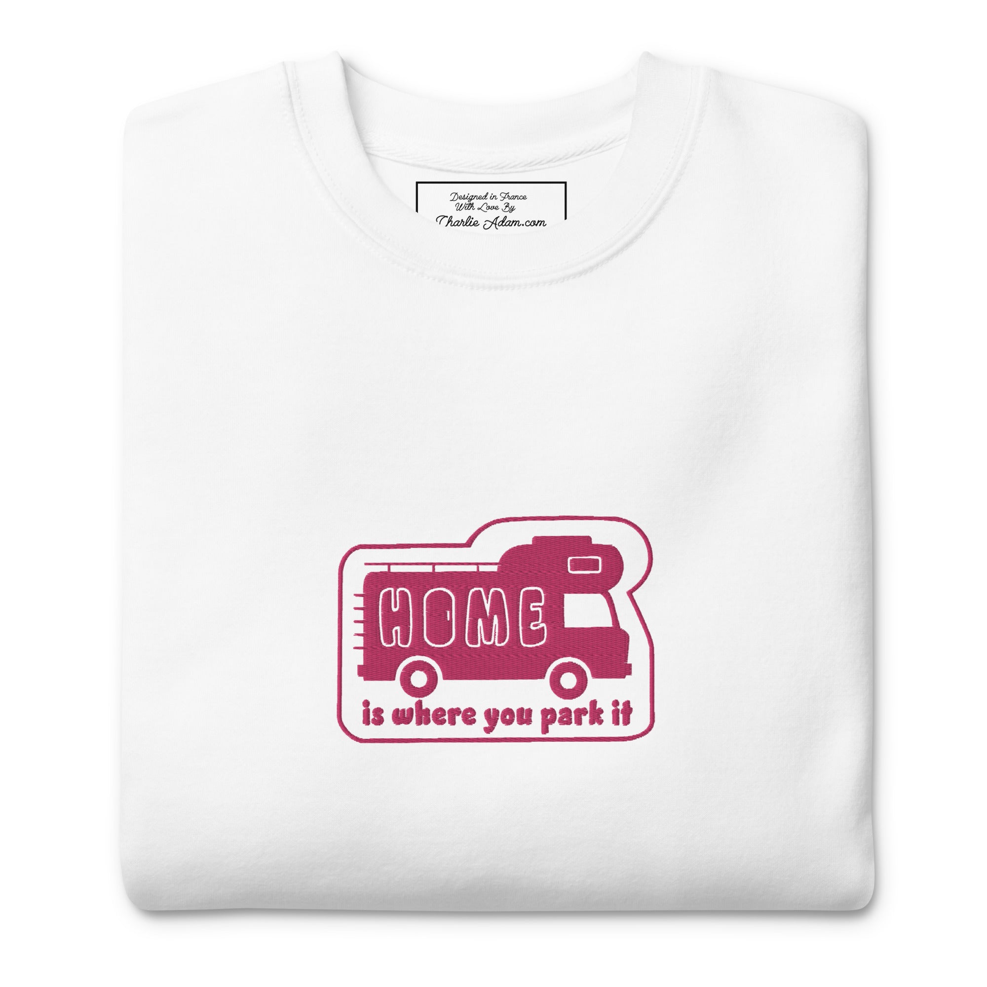 Unisex Premium Sweatshirt Bold Camper Van Home is where you park it flamingo embroidered pattern